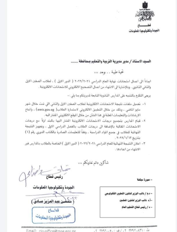 ۱- تحميل ملفات نتيجة الامتحانات الالكترونية لطلاب الصفين الاول والثاني التي تمت خلال شهر مايو الماضي، وذلك من خلال التطبيق الالكتروني لاستمارة الطلاب emis.gov.eg) ، واتباع الارشادات والتعليمات المعلنة في هذا الشأن من خلال الموقع الإلكتروني المشار اليه .