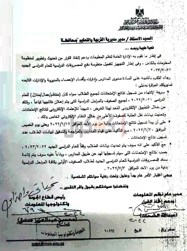 عممت وزارة التربية والتعليم والتعليم الفني، خطابا على المديريات التعليمية بجميع محافظات الجمهورية، بشأن تفعيل منظومة دفع المصروفات الدراسية للعام الدراسي الجديد 2022/2023.
