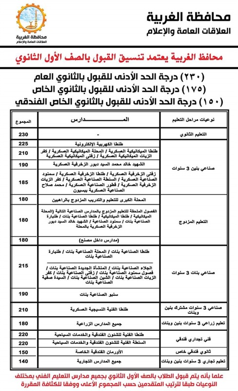وتقرر أن يكون الحد الأدنى للقبول بالثانوي العام ( 230) درجة، الحد الأدنى للقبول بالثانوي الخاص( 175) درجة والحد الأدنى للقبول بالثانوي الخاص الفندقي ( 150 ) درجة ، على أن يكون الحد الأدنى للقبول بالصف الأول الثانوي بمدارس التعليم الفني بنوعيتها طبقا للجدول المرفق.