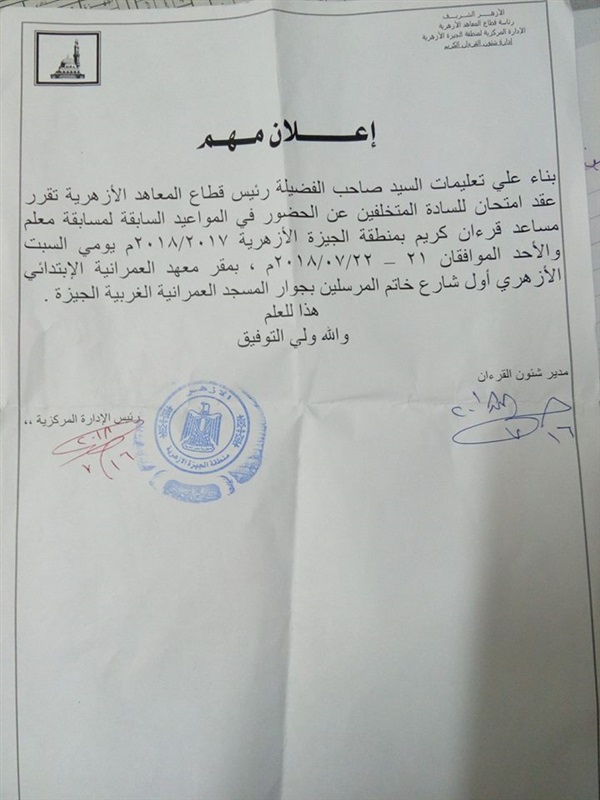 حصل "كشكول" على قرار رئيس قطاع المعاهد الأزهرية، الشيخ صالح عباس، بشأن عقد امتحان للمتخلفين عن الحضور في المواعيد المحددة لمسابقة معلم مساعد قرآن كريم بمنطقة الجيزة الأزهرية، يومي 21 و22 يوليو المقبلين، في مقر معهد العمرانية الابتدائي الأزهري.