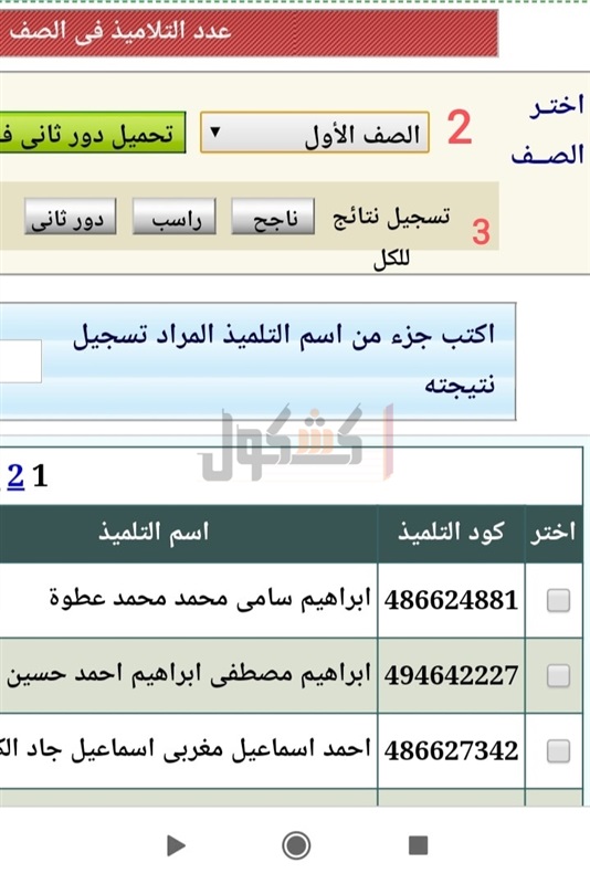 فتح صفحة تسجيل النتائج من اختر الصف هنختار الصف الاول ومن تسجيل نتائج للكل نختار