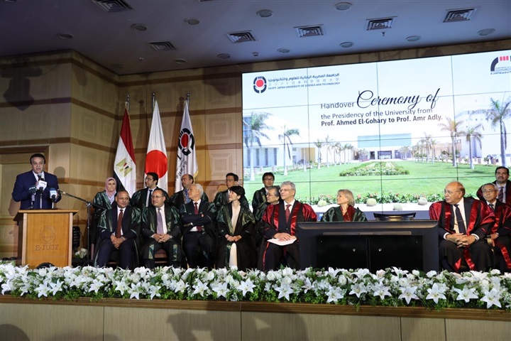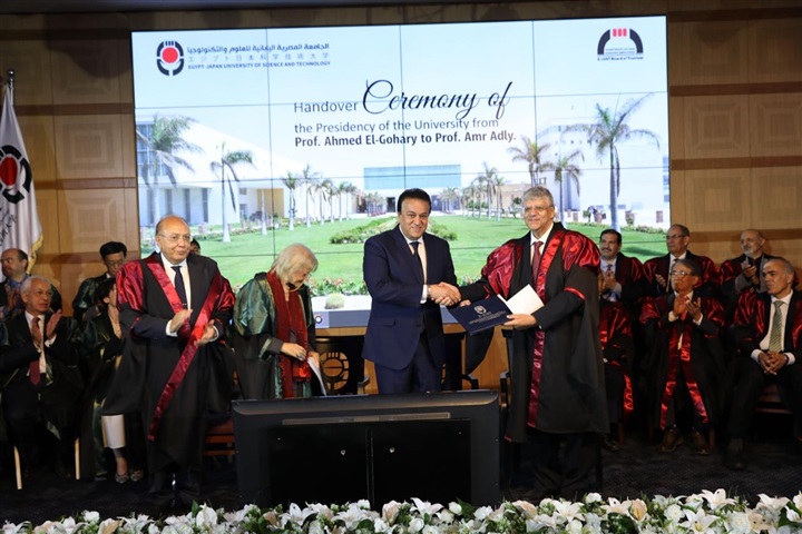 شهد الدكتور خالد عبدالغفار وزير التعليم العالي والبحث العلمي، مساء اليوم الثلاثاء، احتفالية الجامعة المصرية اليابانية للعلوم والتكنولوجيا (E-JUST)، بتنصيب رئيس الجامعة الجديد، حيث تمت مراسم تسليم وتسلم رئاسة الجامعة من الدكتور أحمد الجوهري إلى الدكتور عمرو عدلي، وذلك بحضور السفيرة فايزة أبو النجا مستشار رئيس الجمهورية للأمن القومي، ورئيس مجلس أمناء الجامعة، واللواء محمد الشريف محافظ الإسكندرية، واللواء خالد شعيب محافظ مطروح، والسفير أوكا هيروشي سفير اليابان بالقاهرة، و إيموتو ساتشيكو النائب الأول لرئيس الوكالة اليابانية للتعاون الدولي (الجايكا)، وأعضاء مجلس أمناء الجامعة من الجانبين المصري والياباني.