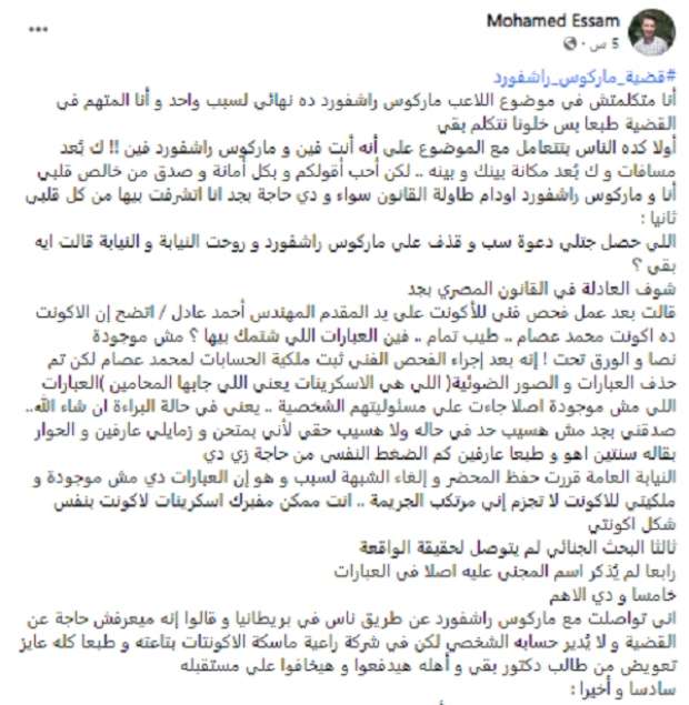 وكتب «عصام» عبر صفحته الشخصية على موقع التواصل الاجتماعي «فيسبوك»: «أنا ماتكلمتش في موضوع اللاعب ماركوس راشفورد ده نهائي لسبب واحد، وأنا المتهم في القضية طبعًا.. الناس بتتعامل مع الموضوع على أنه أنت فين وماركوس راشفورد فين! بُعد مسافات والمكانة بينك وبينه، لكن أحب أقولكم أنا وماركوس راشفورد قدام طاولة القانون سواء ودي حاجة بجد أنا اتشرفت بيها من كل قلبي».
