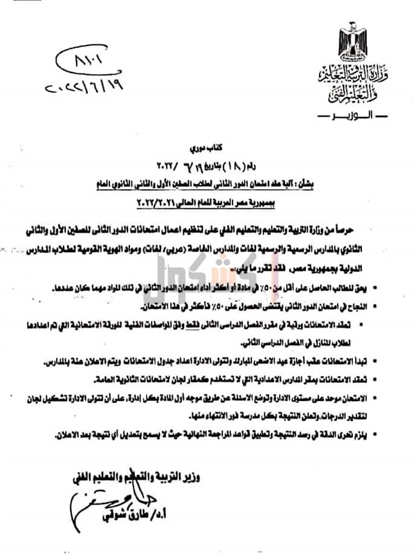 بتوقيع «شوقي».. كتاب دوري للمديريات بشأن امتحانات الدور الثاني لأولى وثانية ثانوي