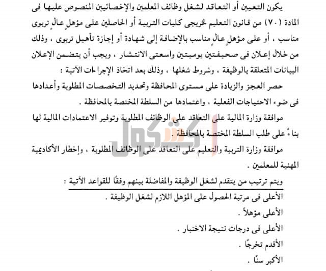 وتضمن التعديل، أن يكون التعيين أو التعاقد لشغل وظائف المعلمين والأخصائيين المنصوص عليها في المادة 70 من قانون التعليم لخريجي كليات التربية أو الحاصلين على مؤهل عال تربوي مناسب، أو على مؤهل عال مناسب بالإضافة إلى شهادة أو إجازة تأهيل تربوي، وذلك من خلال إعلان في صحيفتين يوميتين واسعتي الانتشار ، ويجب أن يتضمن الإعلان البيانات المتعلقة بالوظيفة، وشروط شغلها وذلك بعد اتخاذ الإجراءات الآتية:
