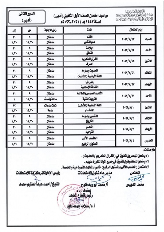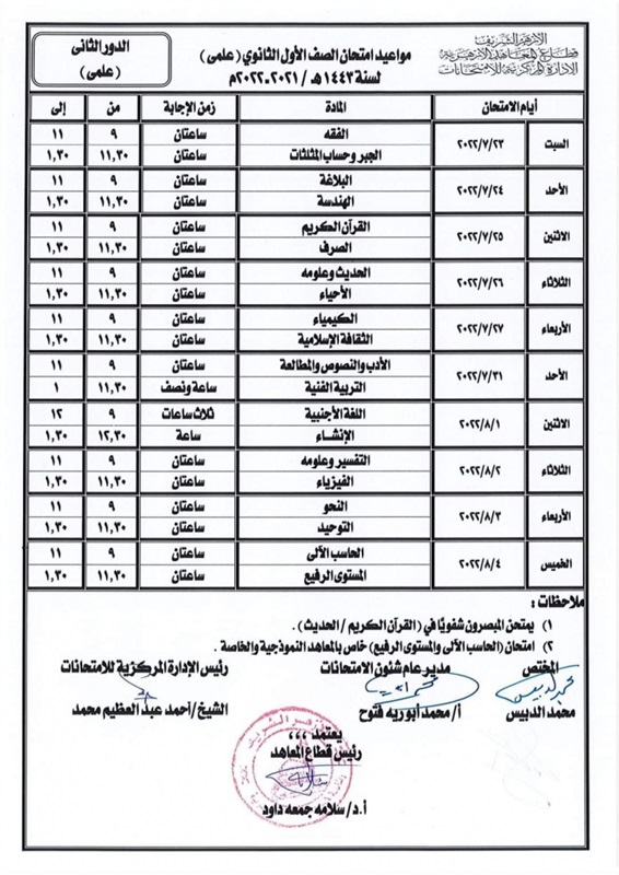 وجاء جدول امتحانات الصف الأول الثانوي الأزهري علمي وأدبي الدور الثاني 2022 كالتالي: