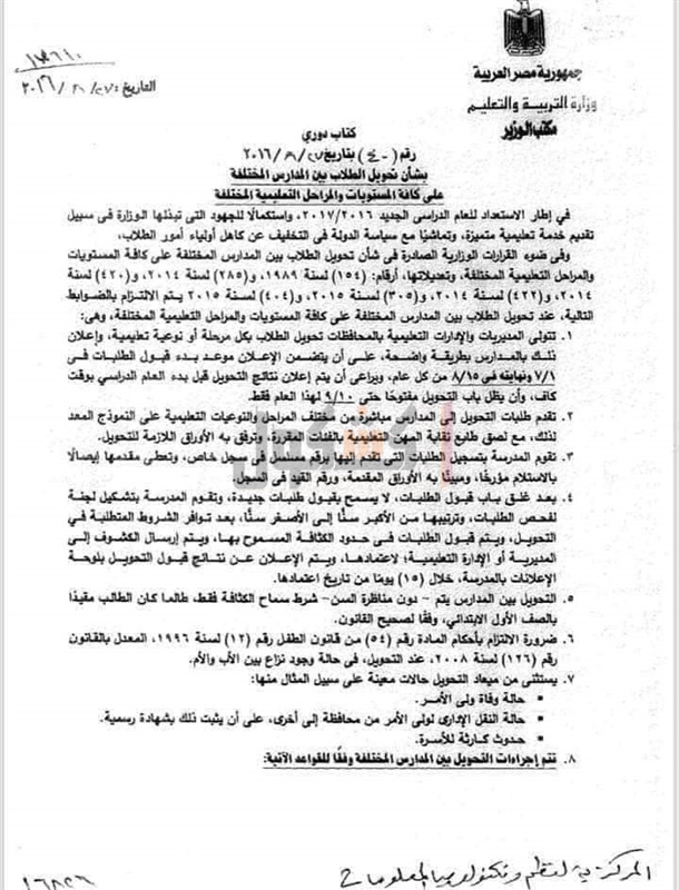 ٧- في جميع الحالات التي يجوز فيها التحويل يشترط وجود مكان شاغر مع تطبيق القواعد و اللوائح التي نص عليها الكتاب الدوري ٢٨٥ لسنه ٢٠١٤ و الكتاب الدوري ٤٠ لسنه ٢٠١٦