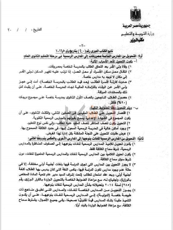 حددت وزارة التربية والتعليم والتعليم الفني، ضوابط التحويلات بين المدارس الرسمية لغات والرسمية المتميزة والخاصة والحكومية والتي تضمنت التالي: