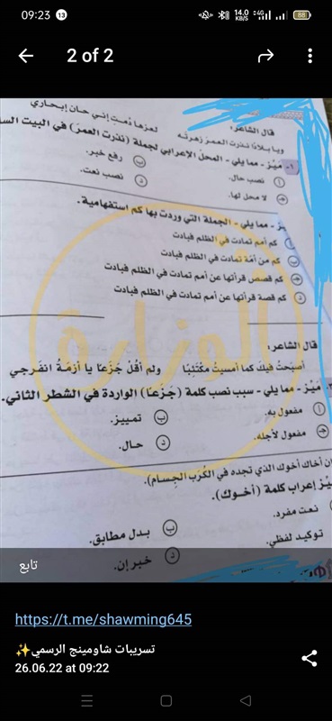 تداول صفحات الغش الاجتماعي عبر تطبيق "التليجرام"، صورا من امتحان مادة اللغة العربية، بعد مرور نصف ساعة من بدء الامتحان، ويزعم البعض أنها أسئلة امتحان اللغة العربية الذي يؤديه الطلاب حاليا داخل اللجان الامتحانية.