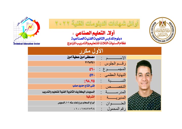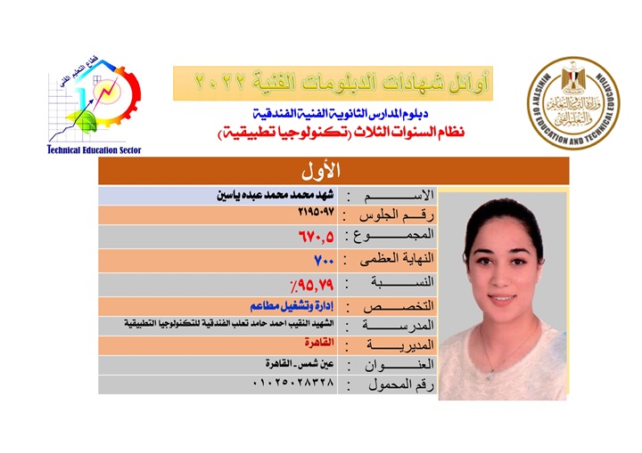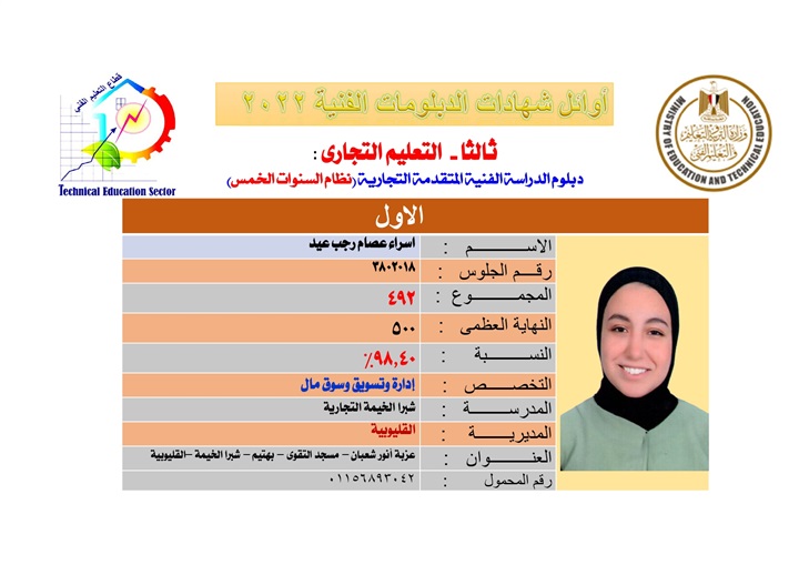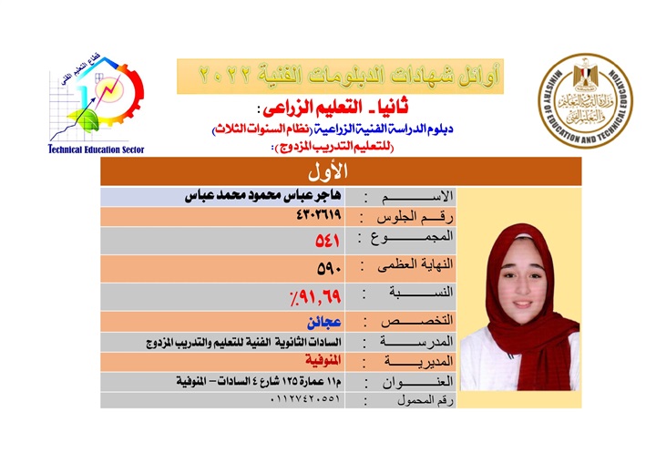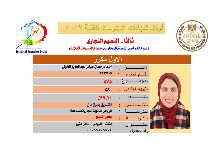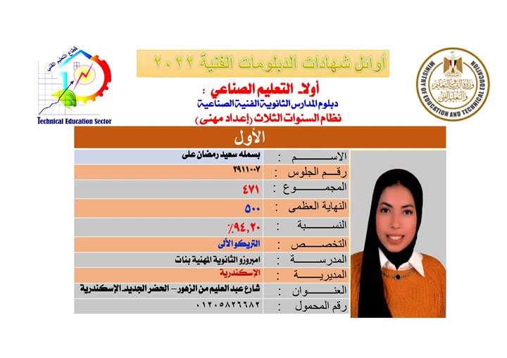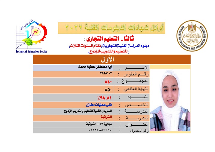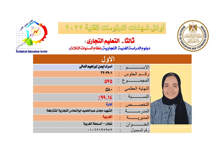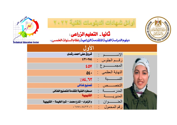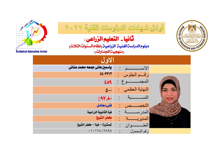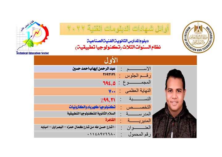 للتعليم الفنى، أوائل شهادات الدبلومات الفنية لعام 2022 تليفونيا والذين بلغ عددهم
