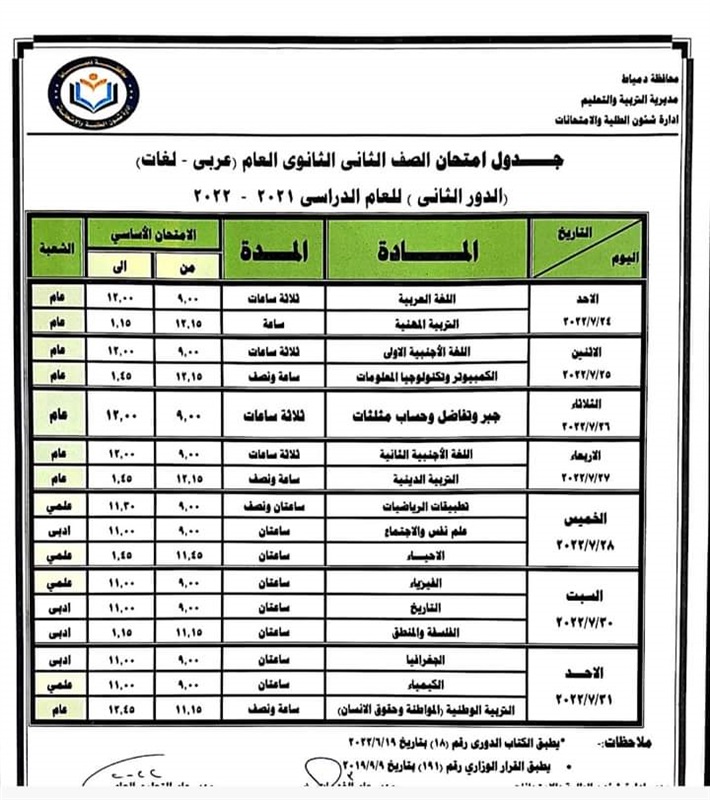 تعليم دمياط تعلن موعد امتحانات الدور الثانى للتعليم الثانوى