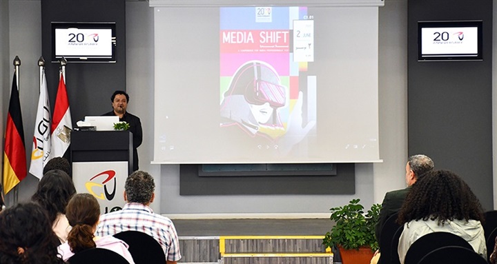في ظل التحولات الذكية و التطورات التكنولوجية الهائلة والمتسارعة التي نشهدها في السنوات الأخيرة في صناعة الأعلام ، نظم قسم تصميم الميديا بكلية العلوم التطبيقة والفنون بالجامعة الألمانية بالقاهرة مؤتمر حول " التحول الإعلامي" دُعي اليه نخبة من الشخصيات المؤثرة في مجالات صناعة الأفلام و الرسوم المتحركة والتصوير الفوتوغرافي و الواقع الافتراضي و الميتافرس و التعليق الصوتي لاستعراض مشوارهم العملي في تلك المجالات لإتاحة الفرصة لطلاب الكلية التعرف عن كثب على أحدث المستجدات و الممارسات و التوجهات الاعلامية المحلية و العالمية فى تلك المجالات من واقع الخبرة الشخصية للمشاركين خاصة فى ظل التكنولوجيات المتلاحقة التى أدت إلى تغيير كلي وجذري في نموذج العمل المعتاد، بجانب تزويد الطلاب بالمعرفة والمهارات الابداعية و الفنية اللازمة التي تمكنهم من التأهل و الانخراط بقوة و كفاءة في اسواق العمل.