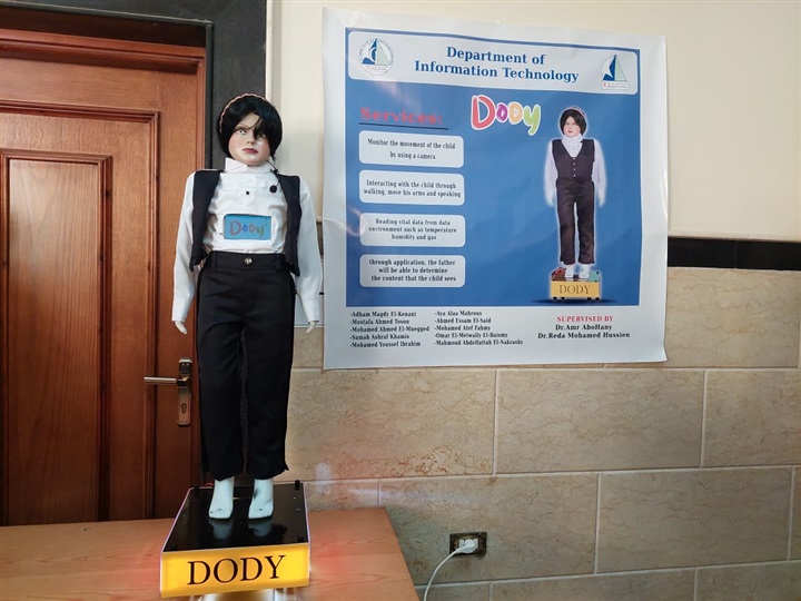 حيث تضمنت مشروعات التخرج أول «روبوت»، جليسة أطفال بالوطن العربي لتتبع أحوال الطفل مصحوبة بتطبيق إلكتروني على جهاز الموبايل الخاص بالأم والأب تمكنهما من متابعة ورؤية الطفل وإرسال تحذيرات في حالة الاستشعار بالخطر أو وجود حريق أو تسريب في الغار وكذلك الترفيه والتسلية مع الطفل حيث يقوم الطفل بتوجيه الأمر لها باللعب فتعطي الطفل أكتر من اختيار للتسلية بإشراف الدكتور عمرو علي سعد عمر المدير التنفيذي للمعلومات والمشروعات بالجامعة والمدرس بقسم نظم المعلومات بالكلية.
