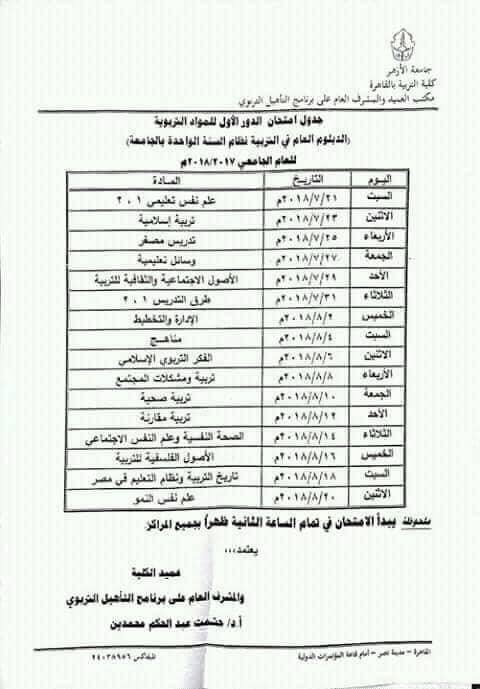 ننشر جدول امتحانات دبلوم "التربية" بجامعة الأزهر