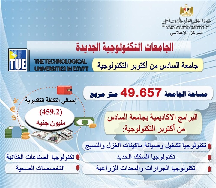 وأوضح المُتحدث الرسمي، أن جامعة السادس من أكتوبر التكنولوجية ستُقدم برامج دراسية جديدة تخدم الصناعة بالمنطقة الجغرافية المحيطة بها، تشمل (تكنولوجيا تشغيل وصيانة ماكينات الغزل والنسيج - تكنولوجيا السكك الحديد- تكنولوجيا الجرارات والمعدات الزراعية - تكنولوجيا الصناعات الغذائية - التخصصات الصحية).