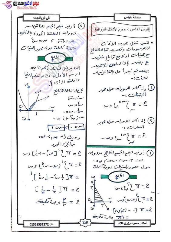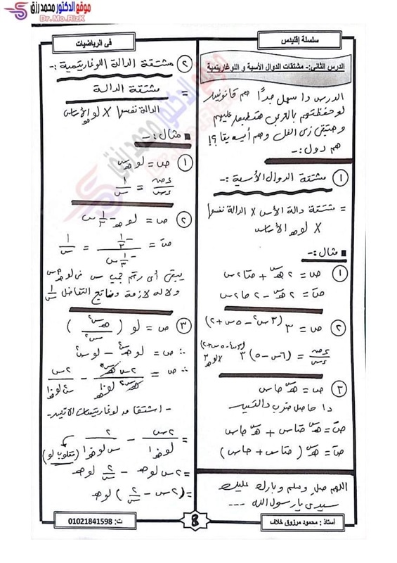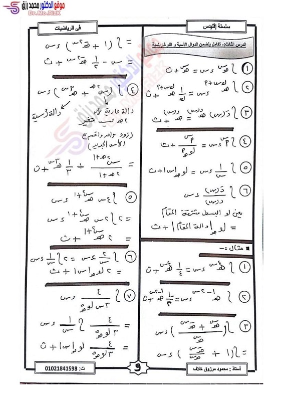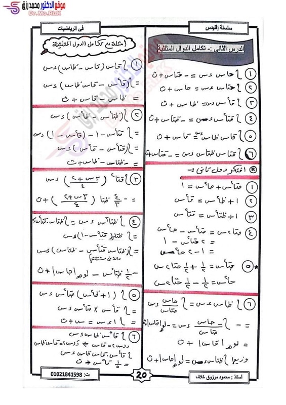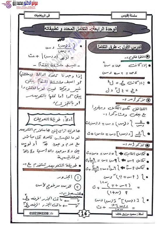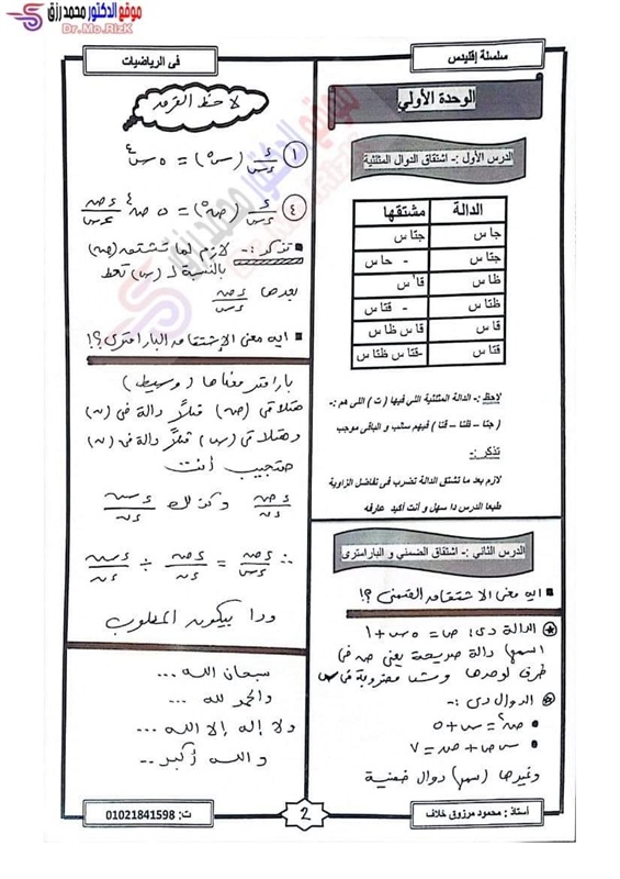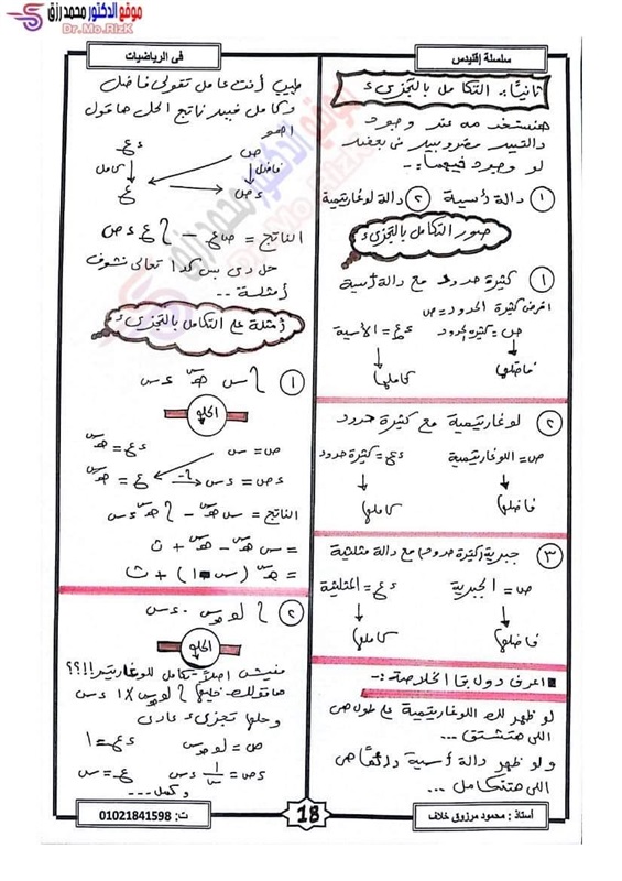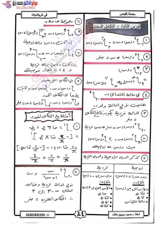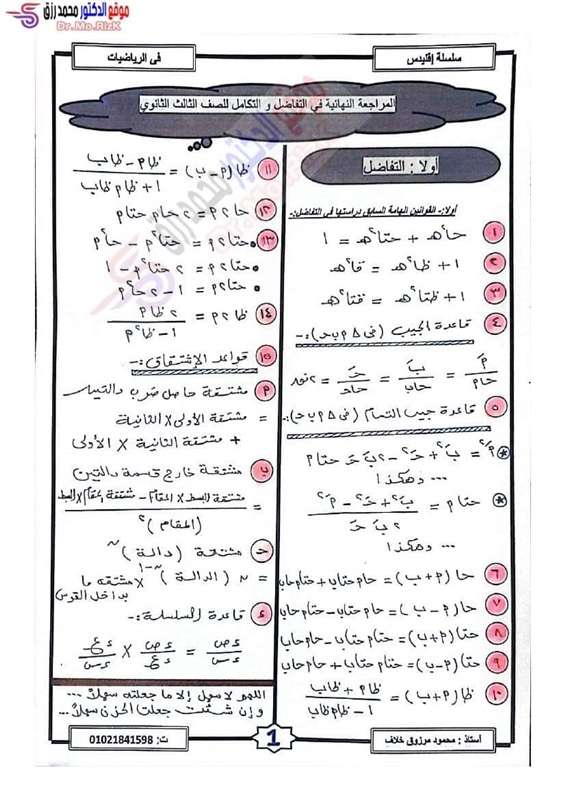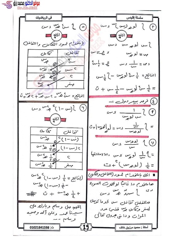 ننشر مراجعة ليلة الامتحان فى التفاضل والتكامل لطلاب علمي رياضة بالثانوية العامة