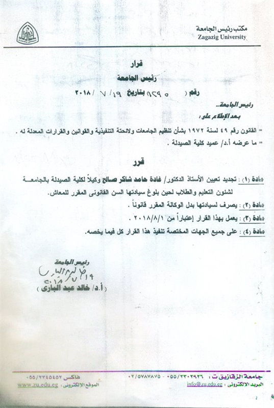 أصدر الدكتور خالد عبدالباري رئيس جامعة الزقازيق القرار رقم (1295) بتاريخ 19/7/2018 بتجديد تعيين الدكتورة غادة حامد شاكر صالح وكيلا لكلية الصيدلة بالجامعة لشئون التعليم والطلاب، لحين بلوغ السن القانونية المقرر للمعاش.