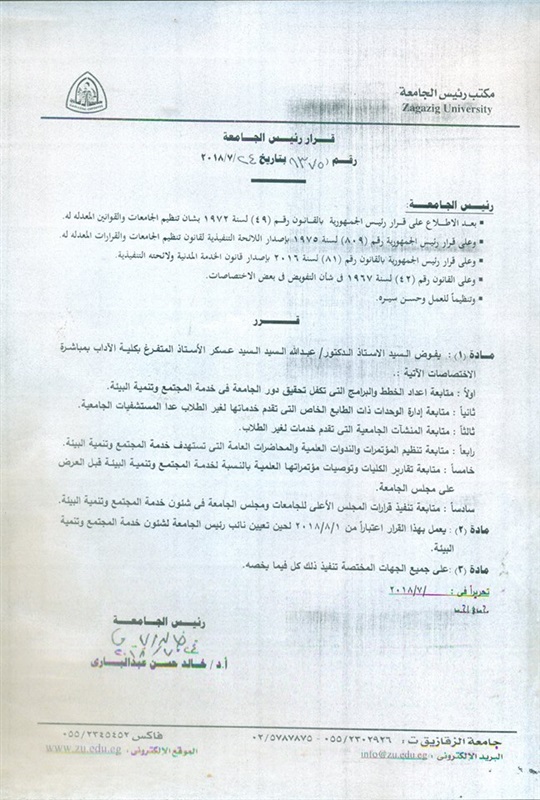 أصدر الدكتور خالد عبد الباري رئيس جامعة الزقازيق، القرار رقم ( 1375 ) بتاريخ 24/7/2018 بتفويض الدكتور عبد الله عسكر الأستاذ المتفرغ بكلية الآداب ونائب رئيس الجامعة لشئون البيئة السابق، بمباشرة عدد من الاختصاصات اعتبارا من أول أغسطس 2018 لحين تعيين نائب رئيس الجامعة لشئون خدمة المجتمع وتنمية البيئة.
