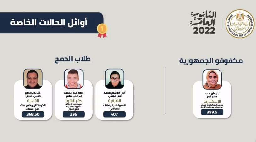 أعلن الدكتور طارق شوقي وزير التربية والتعليم والتعليم الفني، أسماء أوائل طلاب الثانوية العامة 2022 الحالات الخاصة.