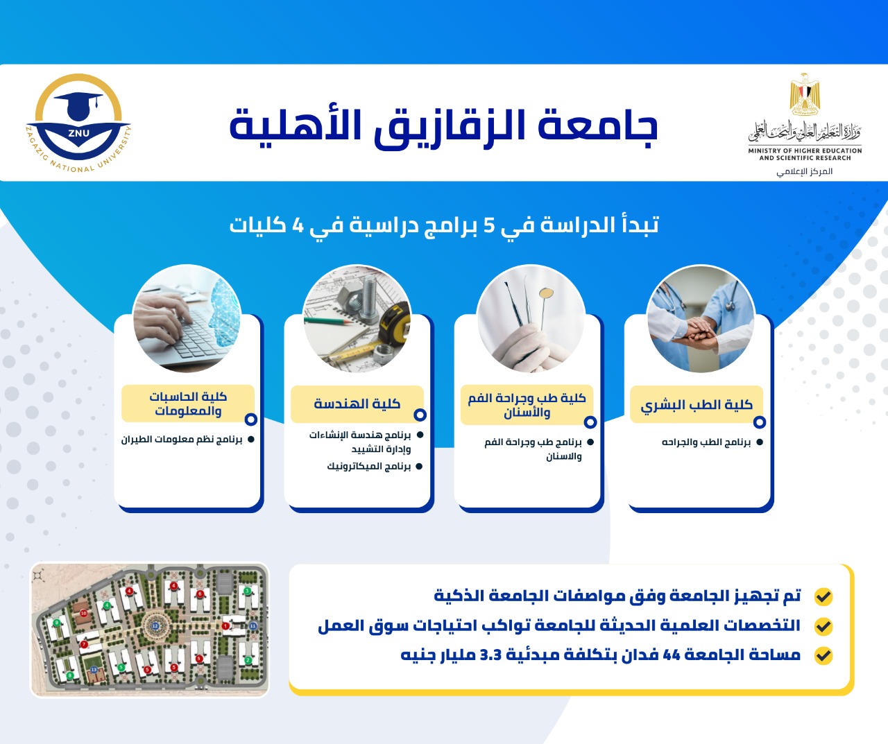 وصرح الدكتور عادل عبدالغفار المُستشار الإعلامي والمُتحدث الرسمي لوزارة التعليم العالي والبحث العلمي، أن التقرير أوضح جاهزية جامعة الزقازيق الأهلية لبدء الدراسة في العام الدراسي الجديد 2022/2023، حيث تقدم كلية الطب والجراحة (برنامج الطب والجراحة العامة)، وتقدم كلية الفم والأسنان (برنامج طب وجراحة الفم والأسنان)، وتقدم كلية الهندسة برنامجي (الميكاترونيك، هندسة الإنشاءات وإدارة التشييد)، وتقدم كلية الحاسبات والمعلومات (برنامج نظم معلومات الطيران).