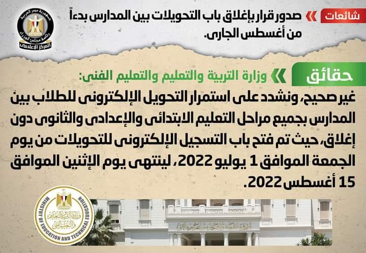 وأكدت وزارة التربية والتعليم، أنه لا صحة لإغلاق باب التحويلات بين المدارس بدءًا من شهر أغسطس الجاري، مُشددةً على استمرار التحويل الإلكتروني للطلاب بين المدارس بجميع مراحل التعليم الابتدائي والإعدادي والثانوي دون إغلاق، حيث تم فتح باب التسجيل الإلكتروني للتحويلات من يوم الجمعة الموافق 1 يوليو 2022، لينتهي يوم الإثنين الموافق 15 أغسطس 2022.
