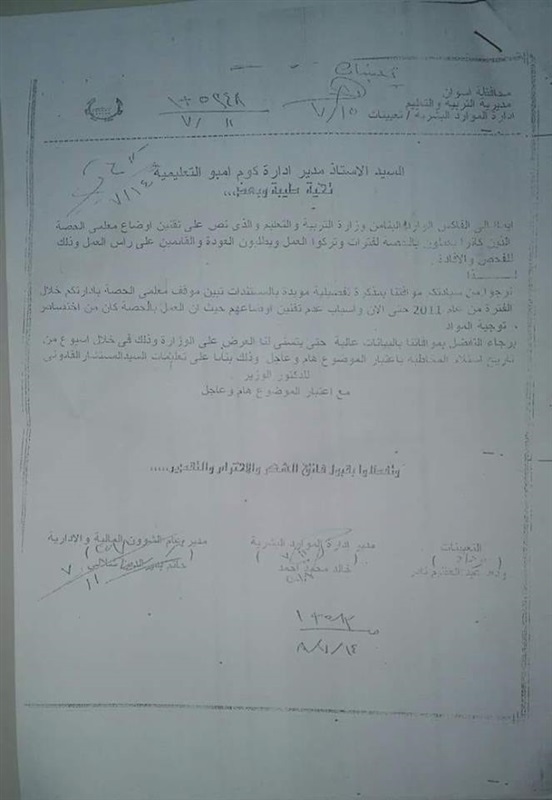 وأوضحوا أن الفاكس الذى وصل من الوزارة لإدارة إدفو