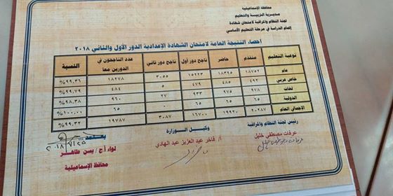اعتمد اللواء يس طاهر محافظ الإسماعيلية نتيجة امتحان الدور الثاني من الشهادة الإعدادية، حيث بلغت نسبة النجاح 99.36 % وتقدم للامتحان 3591 حضر منهم 3224 نجح 3087.