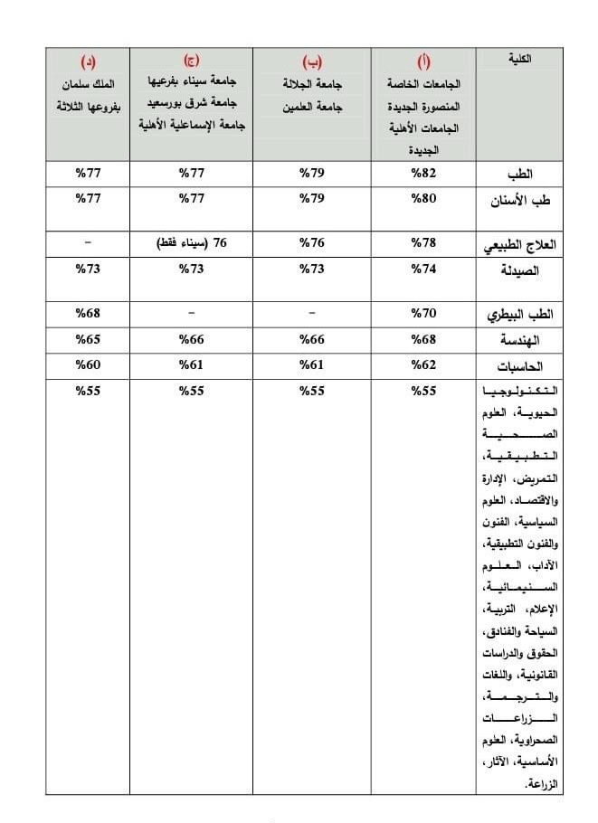 الحد الأدنى للقبول بالجامعات الخاصة والأهلية