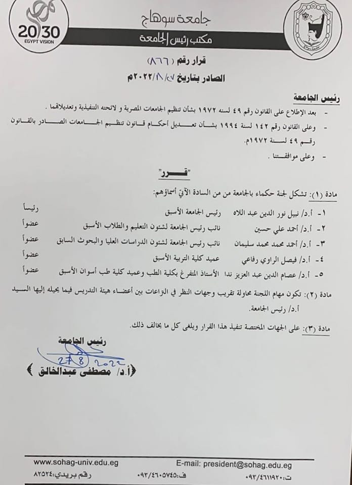 أصدر الدكتور مصطفى عبدالخالق رئيس جامعة سوهاج، قرارًا بتشكيل لجنة حكماء بالجامعة، تكون مهمتها محاولة تقريب وجهات النظر وحل المشكلات البسيطة بين منسوبي جامعة سوهاج، فيما يحيله إليها رئيس جامعة سوهاج.