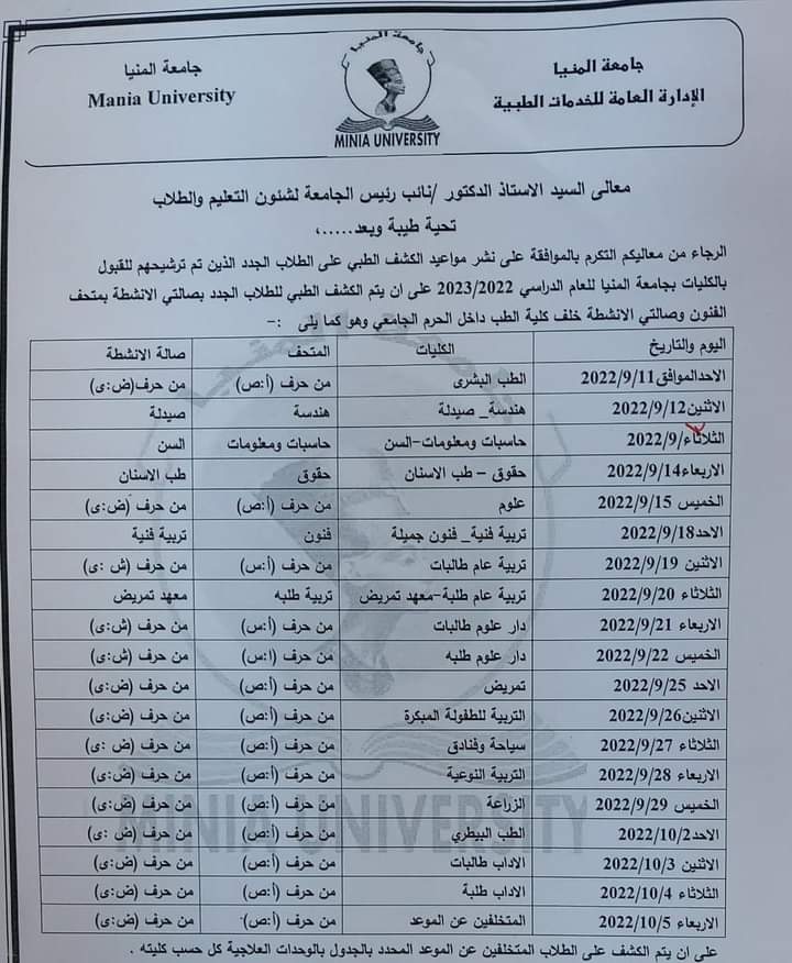 عاجل.. بدء الكشف الطبى على الطلاب الجدد بجامعة المنيا الأحد 11 سبتمبر