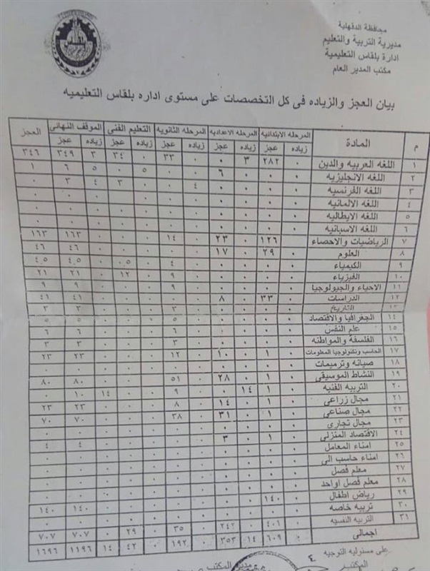 ننشر بيان العجز والزيادة بمعلمي الدقهلية في جميع التخصصات