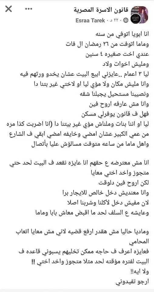 وكتبت الفتاة: "أنا ابويا توفى من سنة، وماما توفيت 26 رمضان اللي فات، عندي اخت صغيرة اربع سنين، ومليش اخوات اولاد، لي ٣ اعمام.. عايزيني أبيع البيت عشان ياخذوا ورثهم فيه، وأنا مليش مكان ولا مأوى لي او لأختي غير بيتنا ده".