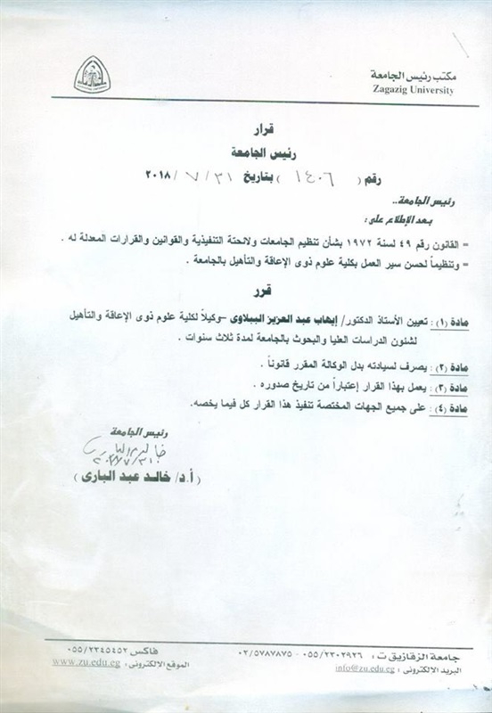أصدر الدكتور خالد عبدالباري رئيس جامعة الزقازيق القرار رقم 1406 بتاريخ 31/7/2018 بتعيين الدكتور إيهاب عبدالعزيز الببلاوي وكيلا لكلية علوم ذوي الإعاقة والتأهيل لشئون الدراسات العليا والبحوث بالجامعة لمدة ثلاث سنوات.