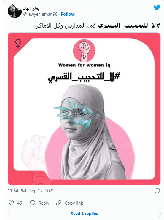 عادت حملة #لا_للتحجيب_القسري لتنشط على منصات التواصل الاجتماعي في العراق بعد انتشار مقطع فيديو لأستاذ في إحدى المدارس وهو يضرب الطالبات اللواتي لا يضعن الحجاب، ولم يتجاوزن سن العاشرة.