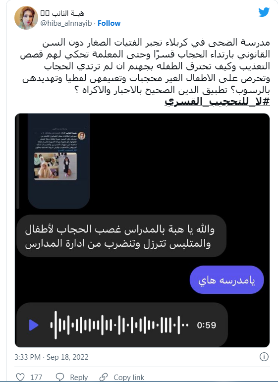 قالت الناشطة والكاتبة النسوية، هبة النائب، في تغريدة نشرتها على منصة تويتر إن مدرسة الضحى في كربلاء تجبر الفتيات الصغار دون السن القانوني بارتداء الحجاب قسرا، مشيرة إلى أن المعلمة "تحكي لهم قصص التعذيب وكيف تحترق الطفلة بجهنم إن لم ترتدي الحجاب".