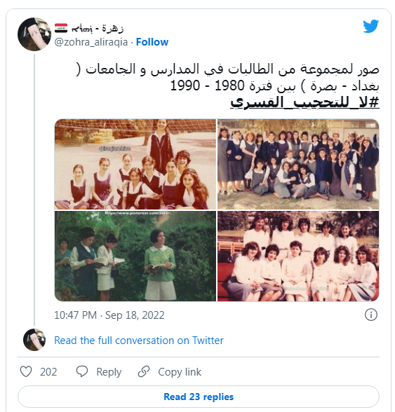 فيما نشر عدد من رواد التواصل صورا لطالبات عراقيات في المدارس والجامعات في فترة الثمانينيات والتسعينيات.