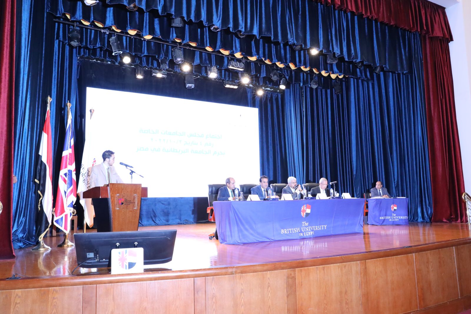 كما وجه المجلس الشُكر لأسرة الجامعة البريطانية، برئاسة الدكتور محمد لطفي رئيس الجامعة، لاستضافة اجتماع مجلس الجامعات الخاصة.