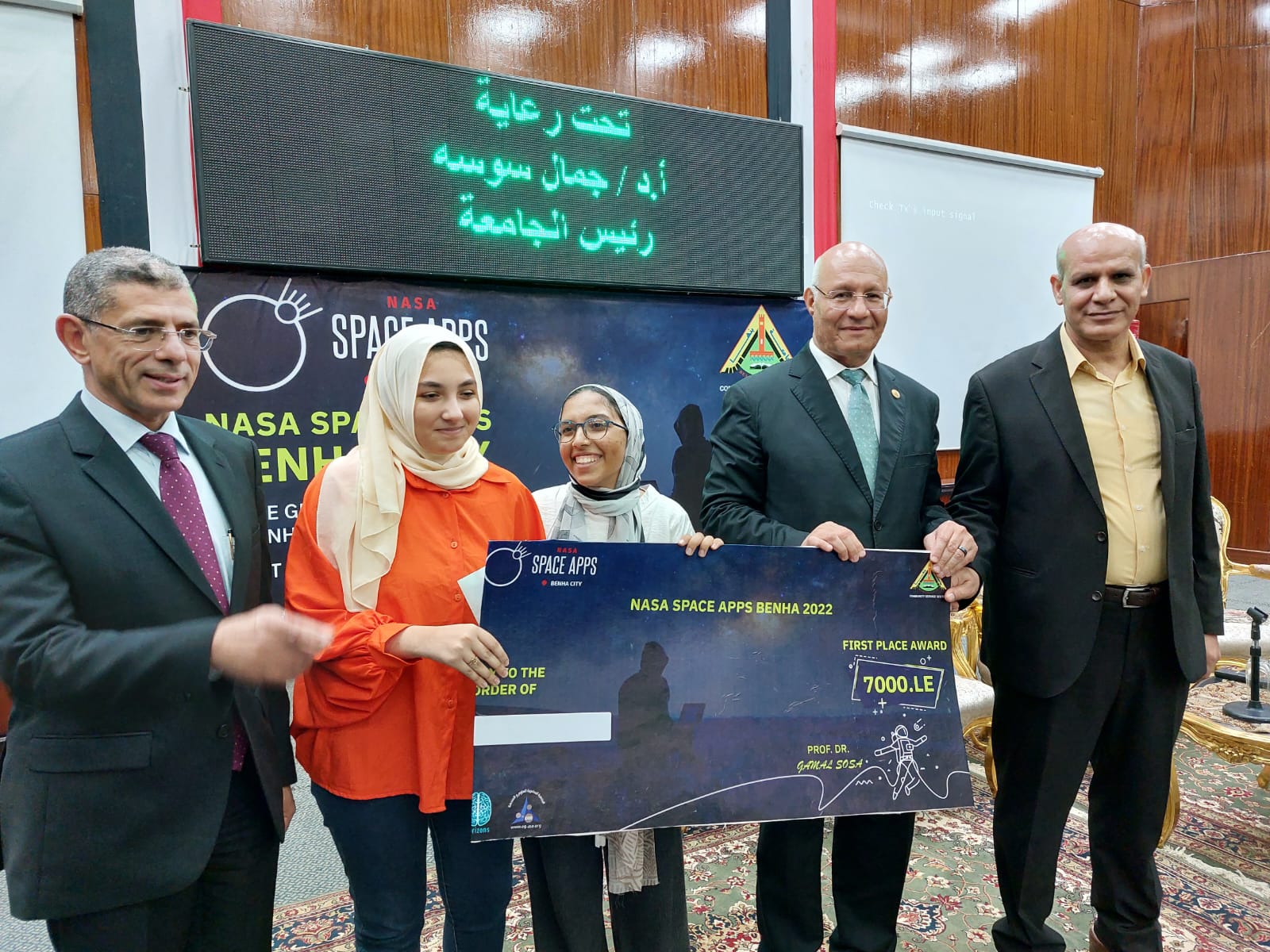 وفي نهاية الاحتفالية قام رئيس جامعة بنها والرئيس التنفيذي لوكالة الفضاء المصرية بتوزيع الجوائز على الفرق الفائزة في فعاليات الهاكاثون في إطار دعم الشباب المشاركين من طلاب المدارس المصرية في أنشطة تطبيقات الفضاء المحلي.