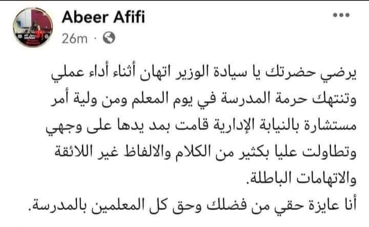 وكانت مديرة المدرسة قد كتبت منشور على صفحتها قالت فيه: يرضي حضرتك سيادة الوزير أتهان أثناء أداء عملي وتنتهك حرمة المدرسة في يوم المعلم من ولية أمر مستشارة بالنيابة الإدارية قامت بمد يدها على وجهي وتطاولت عليا بالألفاظ غير اللائقة والاتهامات الباطلة، أنا عايزة حقي وحق كل المعلمين بالمدرسة).