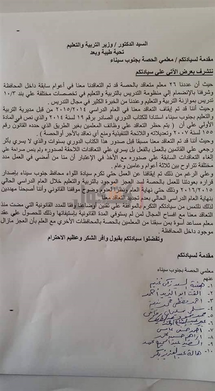 قدم عدد من معلمى الحصة بجنوب سيناء شكوى لوزير التربية والتعليم الدكتور طارق شوقي، أكدوا خلالها أنهم 26 معلم تم التعاقد معهم بالحصة علي بند 3/10 تدريس بموازنة التربية والتعليم.