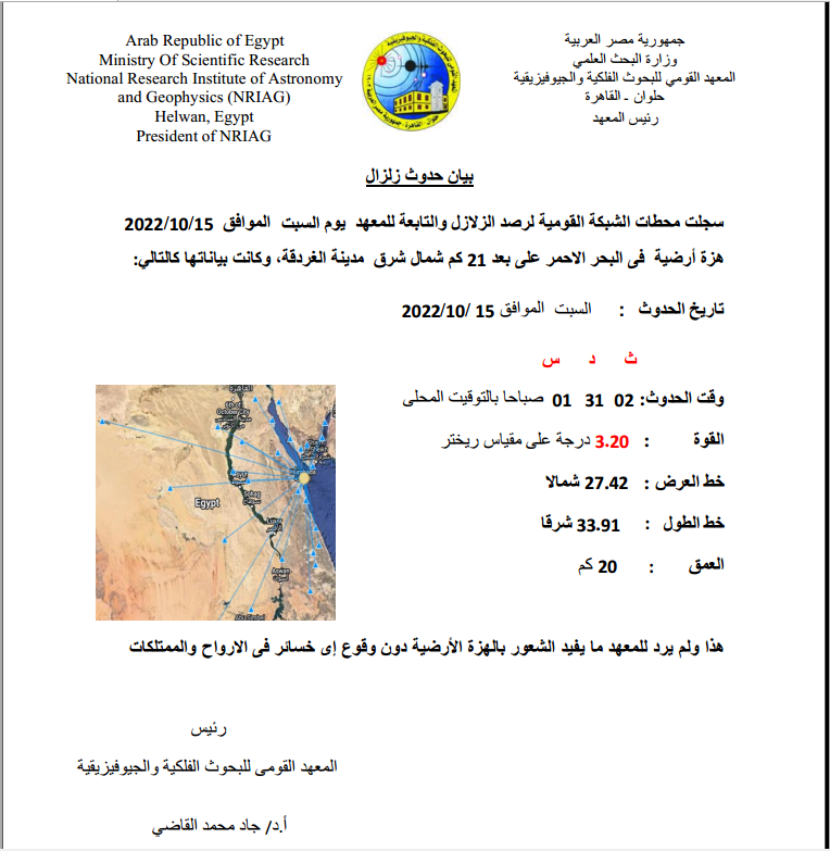قال الدكتور جاد محمد القاضي رئيس المعهد القومي للبحوث الفلكية والجيوفيزيقية، إن محطات الشبكة القومية لرصد الزلازل والتابعة للمعهد سجلت يوم السبت الموافق 15/10/2022هزة أرضية في البحر الأحمر على بعد 21 كم شمال شرق مدينة الغردقة، وكانت بياناتها كالتالي: