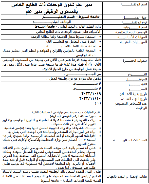 - مدير عام شئون الوحدات ذات الطابع الخاص بالمستوى الوظيفي مدير عام، وصف الوظيفة "الإشراف على شئون الوحدات ذات الطابع الخاص".
