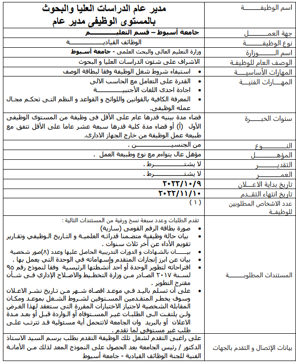 - مدير عام الدراسات العليا والبحوث بالمستوى الوظيفي مدير عام، وصف الوظيفة "الإشراف عللا شئون الدراسات العليا والبحوث".