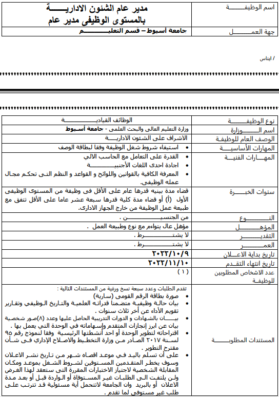 - مدير عام الشئون الإدارية المستوى الوظيفي مدير عام، وصف الوظيفة "الإشراف على الشئون الإدارية".