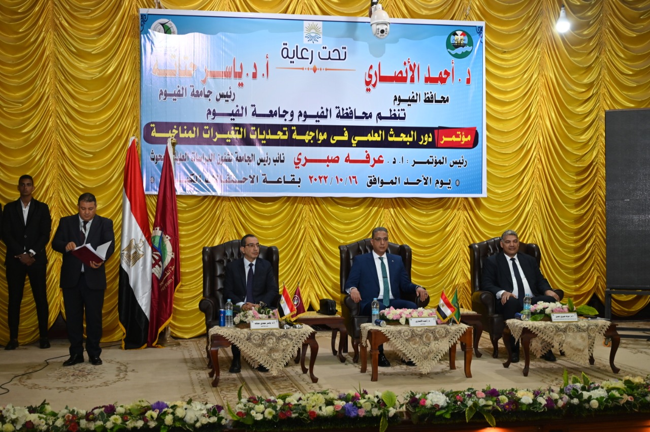 شهد الدكتور أحمد الأنصاري محافظ الفيوم، والدكتور ياسر مجدي حتاته رئيس جامعة الفيوم، انطلاق فعاليات المؤتمر العلمي الذي تنظمه محافظة الفيوم بالتعاون مع جامعة الفيوم، حول دور البحث العلمي في مواجهة تحديات التغيرات المناخية، برئاسة الدكتور عرفه صبري نائب رئيس الجامعة لشئون الدراسات العليا والبحوث، بحضور الدكتور محمد فاروق الخبيري نائب رئيس الجامعة لشئون التعليم والطلاب، والدكتور محمد عماد نائب محافظ الفيوم، وعدد من العمداء والوكلاء والطلاب، وذلك اليوم الأحد ١٦ أكتوبر ٢٠٢٢ بقاعة الاحتفالات الكبرى بالجامعة.