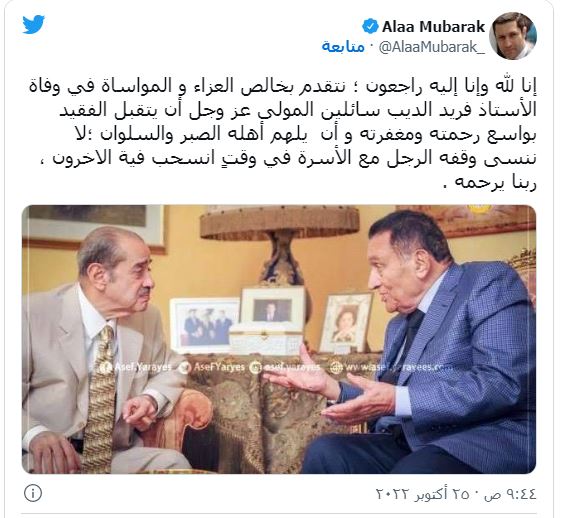 نعى علاء مبارك نجل الرئيس الراحل محمد حسني مبارك، المحامي فريد الديب، الذي توفي بعد صراع مع المرض.