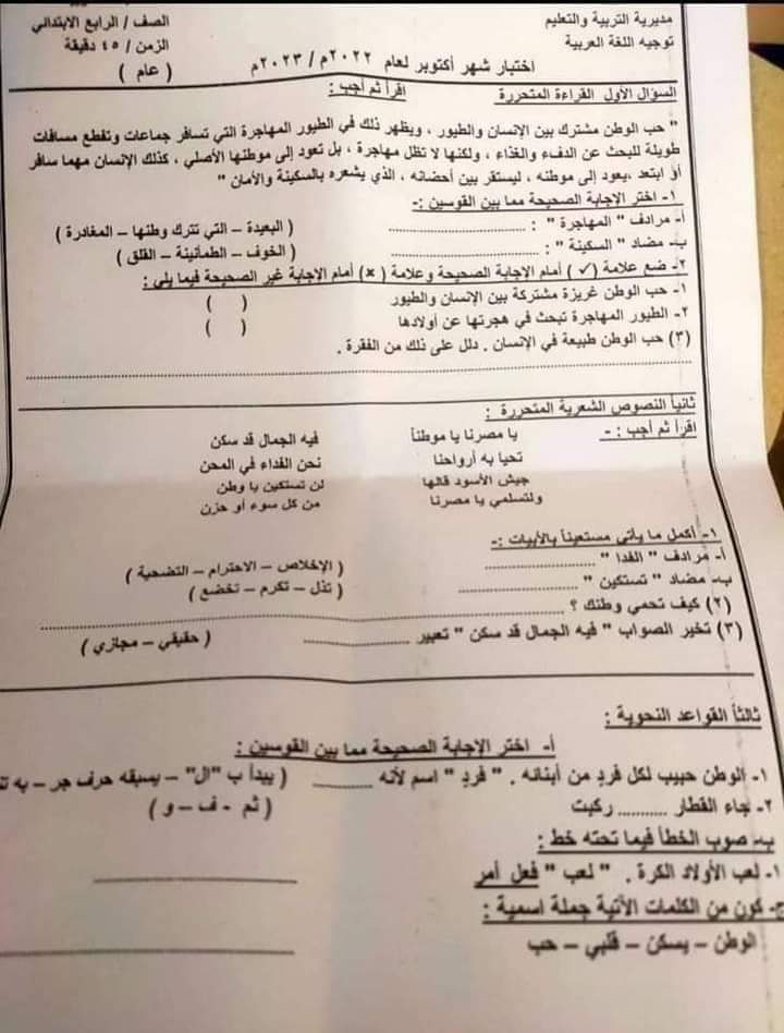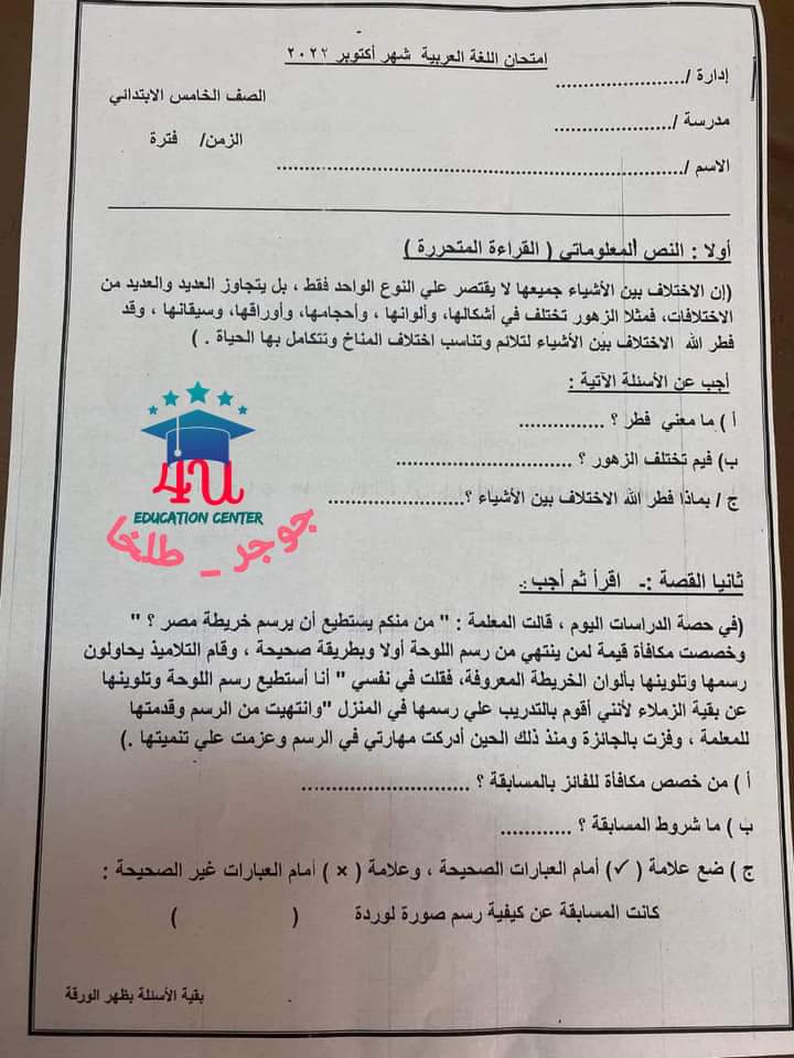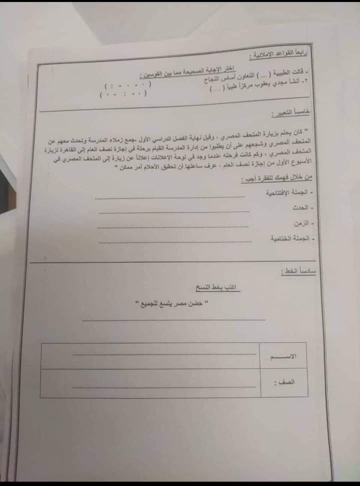 حصل «كشكول» على صور لامتحان اللغة العربية لطلاب رابعة وخامسة ابتدائي لشهر أكتوبر 2022 التي عقدت اليوم الأربعاء الموافق 26 أكتوبر 2022 بمحافظة دمياط.