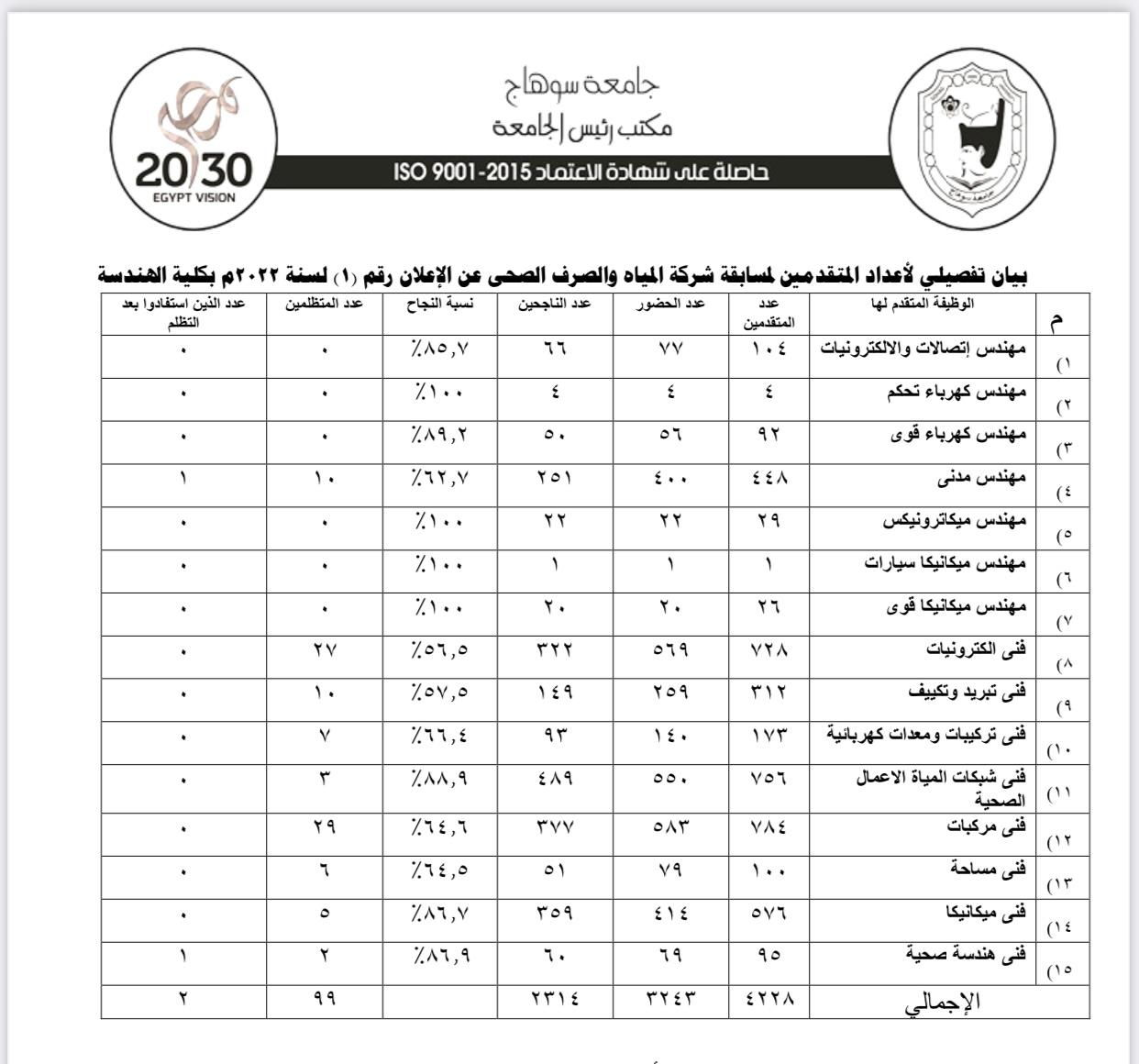 وأوضح الدكتور مصطفى عبدالخالق رئيس جامعة سوهاج، أن إجراء امتحانات المسابقة وكذلك عملية التصحيح لهذه الوظائف قد جاءت بناءًا على الطلب الذي تقدم به المهندس محمد صلاح الدين مدير فرع الشركة بسوهاج، وأنها جاءت ضمن دور الجامعة في خدمة المجتمع المحيط، وقد تم تكليف عمداء الكليات المعنية الثلاث (التجارة - العلوم - الهندسة) جامعة سوهاج بتشكيل مجموعة عمل داخل كل كلية للإشراف على وضع الأسئلة وأعمال الملاحظات والمراقبات ثم تصحيح الامتحانات، وإبلاغ النتائج لإدارة الشركة، حيث تقدم لاداء الاختبارت (25008) وتم التصحيح إلكتروني، حيث بلغت أعداد الناجحين 11826 (47.3% من المتقدمين).