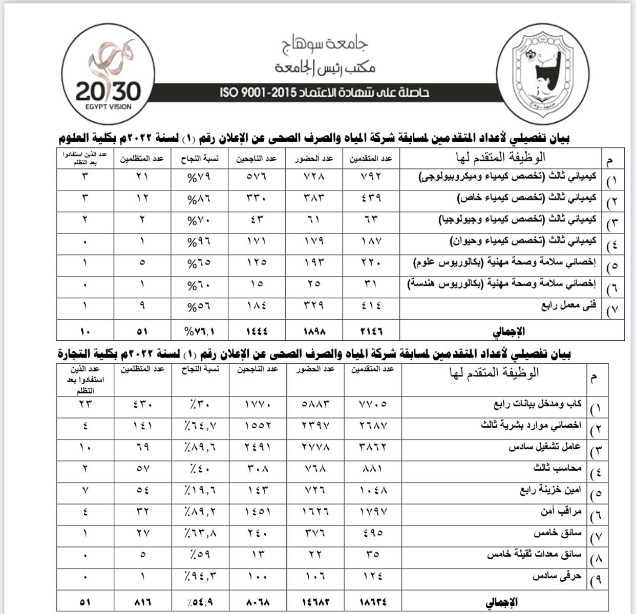 أعلنت جامعة سوهاج، بيان إعلامي بشأن ما تم تداوله على صفحات التواصل الاجتماعي حول نتيجة التظلمات للمتقدمين لمسابقة التوظيف رقم 2 لعام 2020 ومسابقة التوظيف رقم 1 لعام 2022، والتي أعلنها قطاع الموارد البشرية بشركة مياه الشرب والصرف الصحي بسوهاج، عبر منشور على الصفحة الرسمية بموقع التواصل الاجتماعي "فيس بوك"، والذي جاء فيه قبول 60 تظلمًا من إجمالي 977 تظلم.