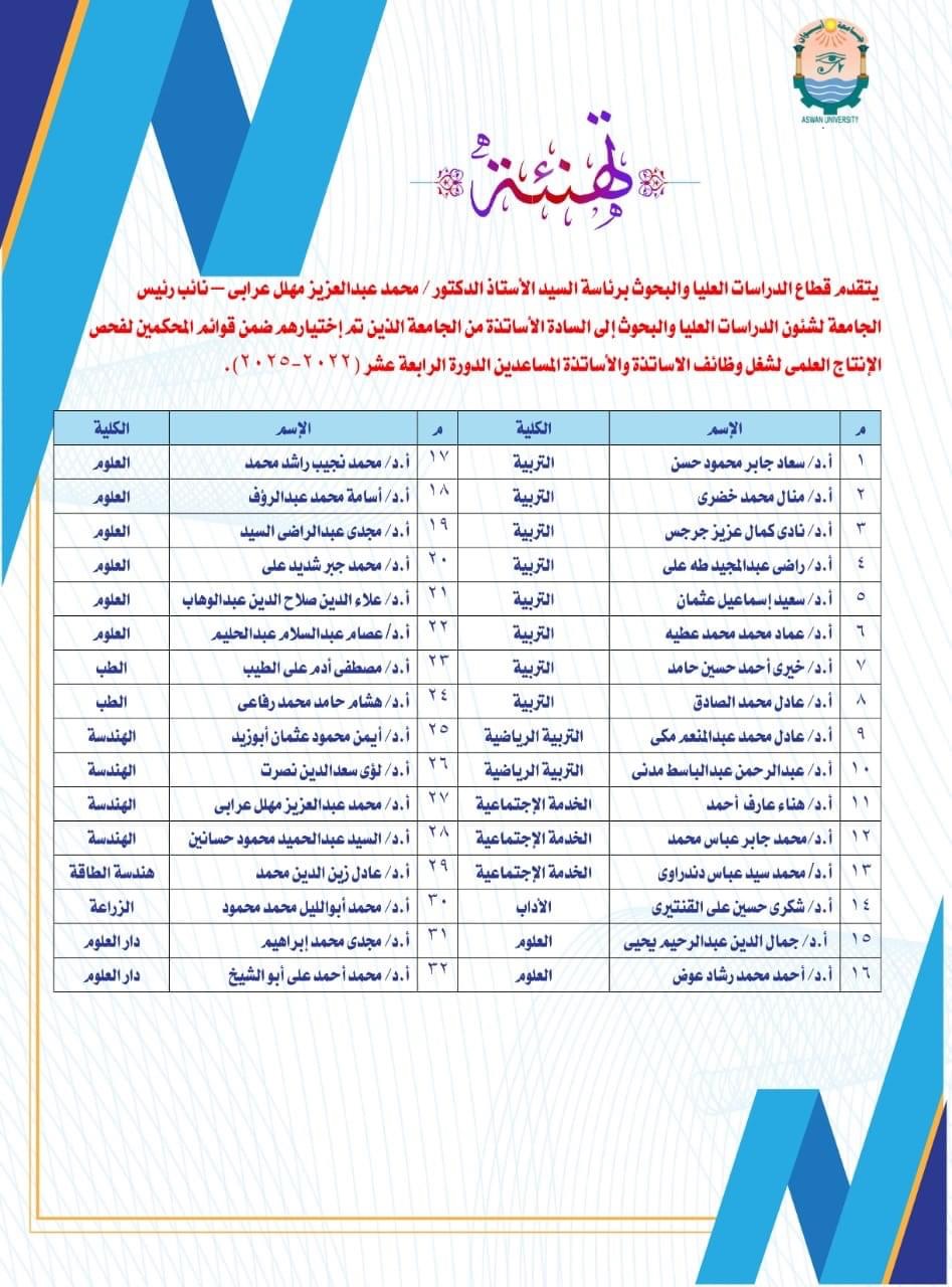 وتضمنت القوائم كلا من الدكتور سعاد جابر محمود حسن كلية التربية، والدكتور محمد نجيب راشد محمد كلية العلوم، والدكتورة منال محمد خضري كلية التربية، والدكتور أسامة محمد عبدالرؤف كلية العلوم، والدكتور نادي كمال عزيز جرجس كلية التربية، والدكتور مجدي عبدالراضى السيد كلية العلوم، والدكتور راضي عبدالمجيد طه علي كلية التربية، والدكتور محمد جبر شديد علي كلية العلوم، والدكتور سعيد إسماعيل عثمان كلية التربية، والدكتور علاء الدين صلاح الدين عبدالوهاب كلية العلوم، والدكتور عماد محمد محمد عطيه كلية التربية، والدكتور عصام عبدالسلام عبدالحليم كلية العلوم، والدكتور خيري أحمد حسين حامد كلية التربية، والدكتور مصطفى أدم علي الطيب كلية الطب، والدكتور عادل محمد عبدالمنعم مكي كلية التربية الرياضية، والدكتور هشام حامد محمد رفاعي كلية الطب، والدكتور عبدالرحمن عبدالباسط مدنى كلية التربية الرياضية، والدكتور أيمن محمود عثمان أبوزيد كلية الهندسة، والدكتورة هناء عارف أحمد الخدمة كلية الاجتماعية، والدكتور لؤى سعدالدين نصرت كلية الهندسة، والدكتور محمد جابر عباس محمد كلية الخدمة الاجتماعية، والدكتور محمد عبدالعزيز مهلل عرابي كلية الهندسة، والدكتور محمد سيد عباس دندراوى كلية الخدمة الاجتماعية، والدكتور السيد عبدالحميد محمود حسانين كلية الهندسة، والدكتور شكري حسين علي القنتيري كلية الآداب، والدكتور عادل زين الدين محمد كلية هندسة الطاقة، والدكتور جمال الدين عبدالرحيم يحيى كلية العلوم، والدكتور محمد أبوالليل محمد محمود كلية الزراعة، والدكتور أحمد محمد رشاد عوض كلية العلوم، والدكتور ياسر عبدالحميد دياب كلية الزراعة.